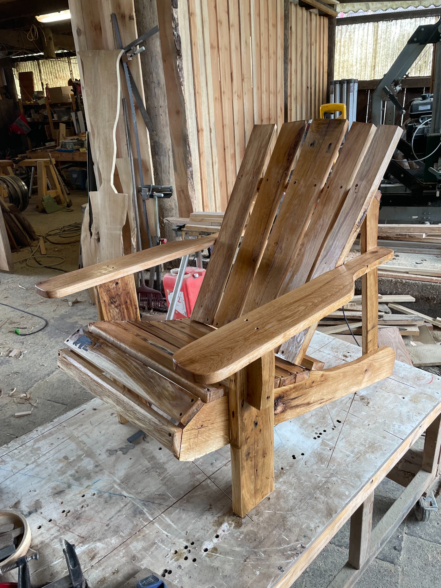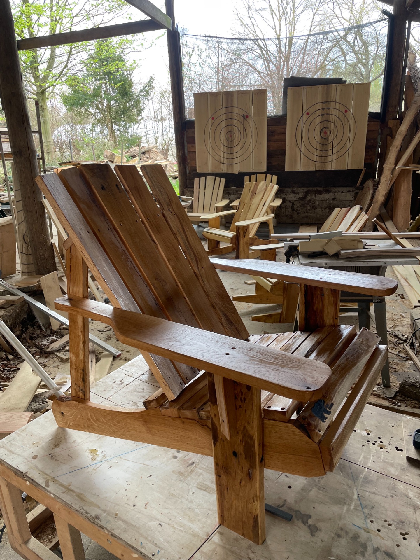 Een bear Chair , een comfortable buiten lounge stoel , deze versie is gemaakt uit een kapotte eiken pallet waarvan we het hout geschaafd,geschuurd en geolied hebben . Een extra stoere look en een uniek upcycle project waarin de markeringen van de palet nog zichtbaar zijn .