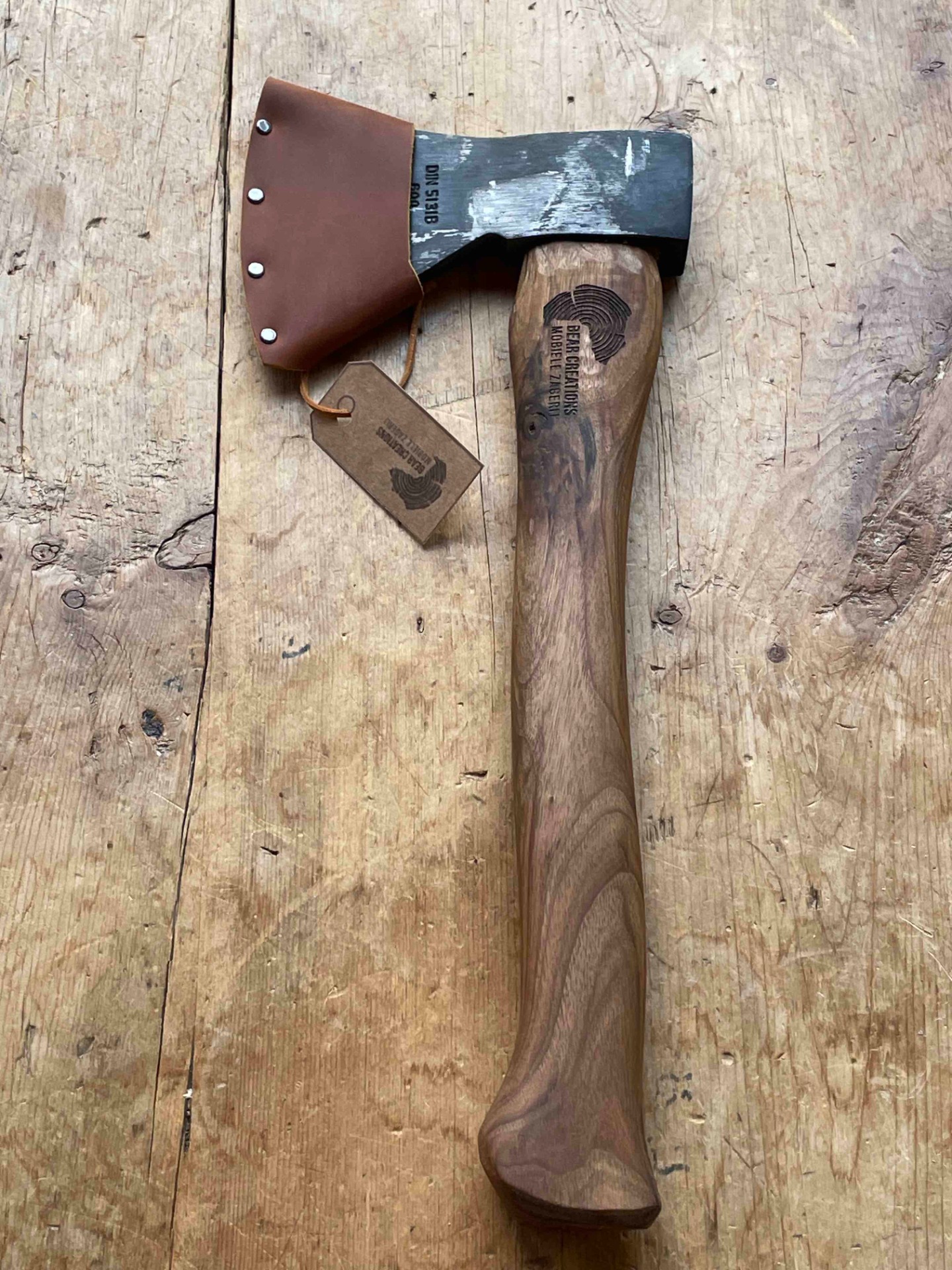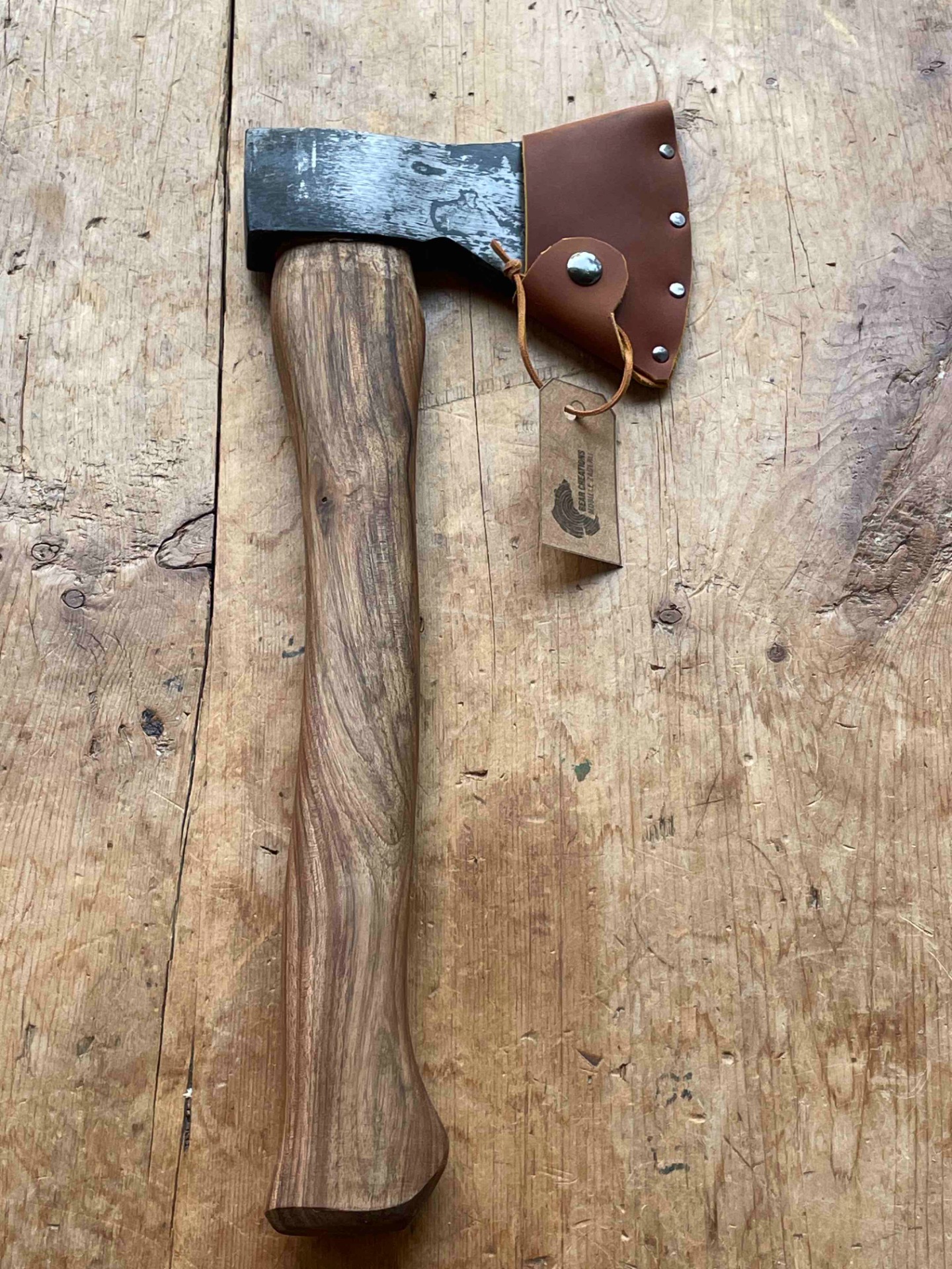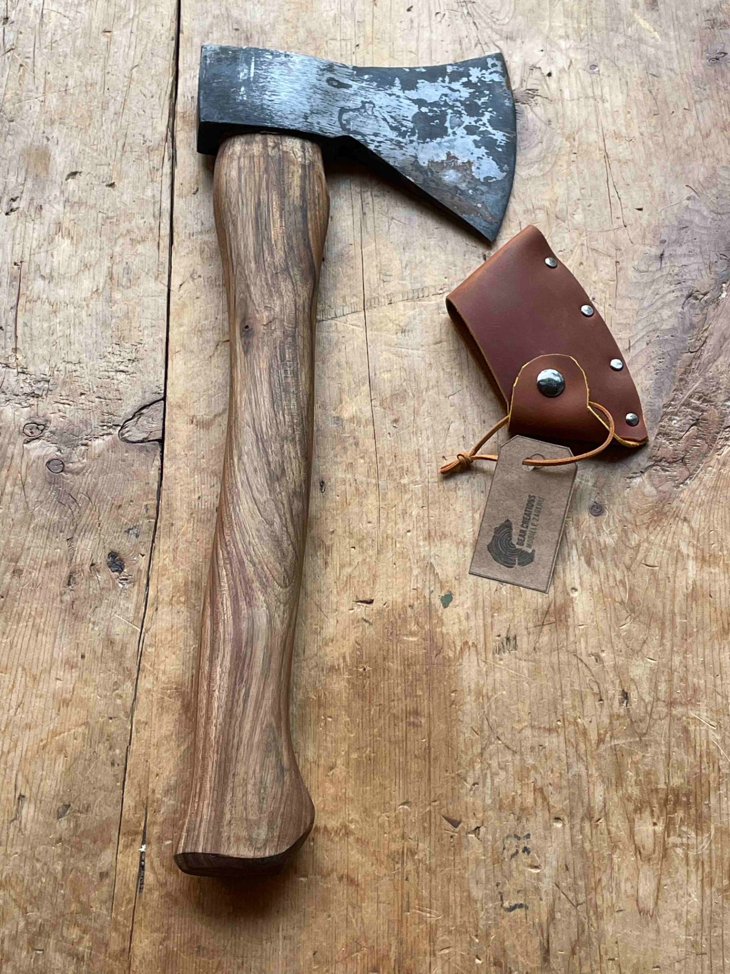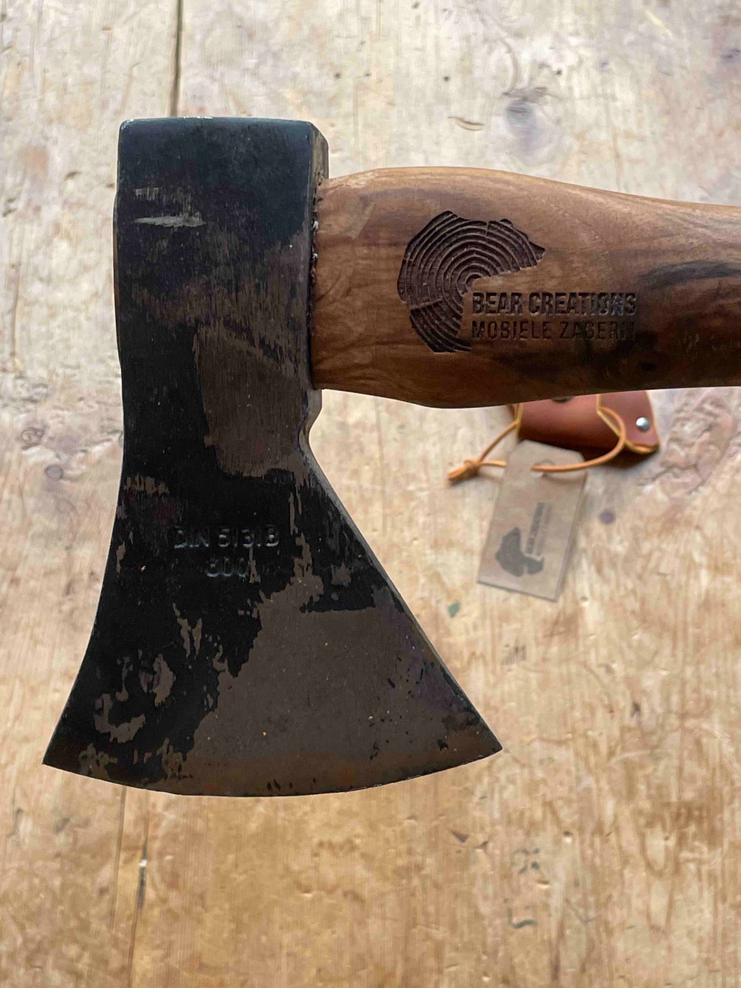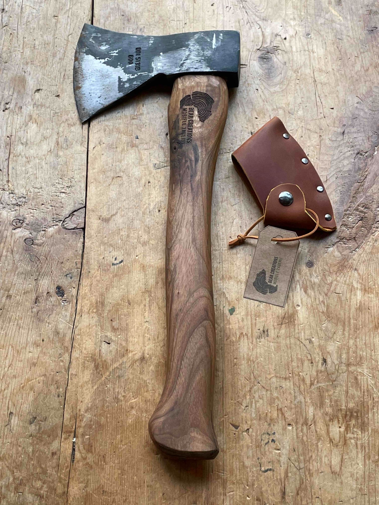 Een bijl met een gesmede kop van 600gr ideaal als bushcraft bij of bijl om lepels te snijden . Een bijlsteel uit lokale europse notelaar voorzien van Ons gelaserd logo . Met handgemaakte bijlcover uit 2mm tuigleder . Word geslepen naar wens . ( scherpere hoek voor lepelsnijders , stompere hoek voor een allround bijl)