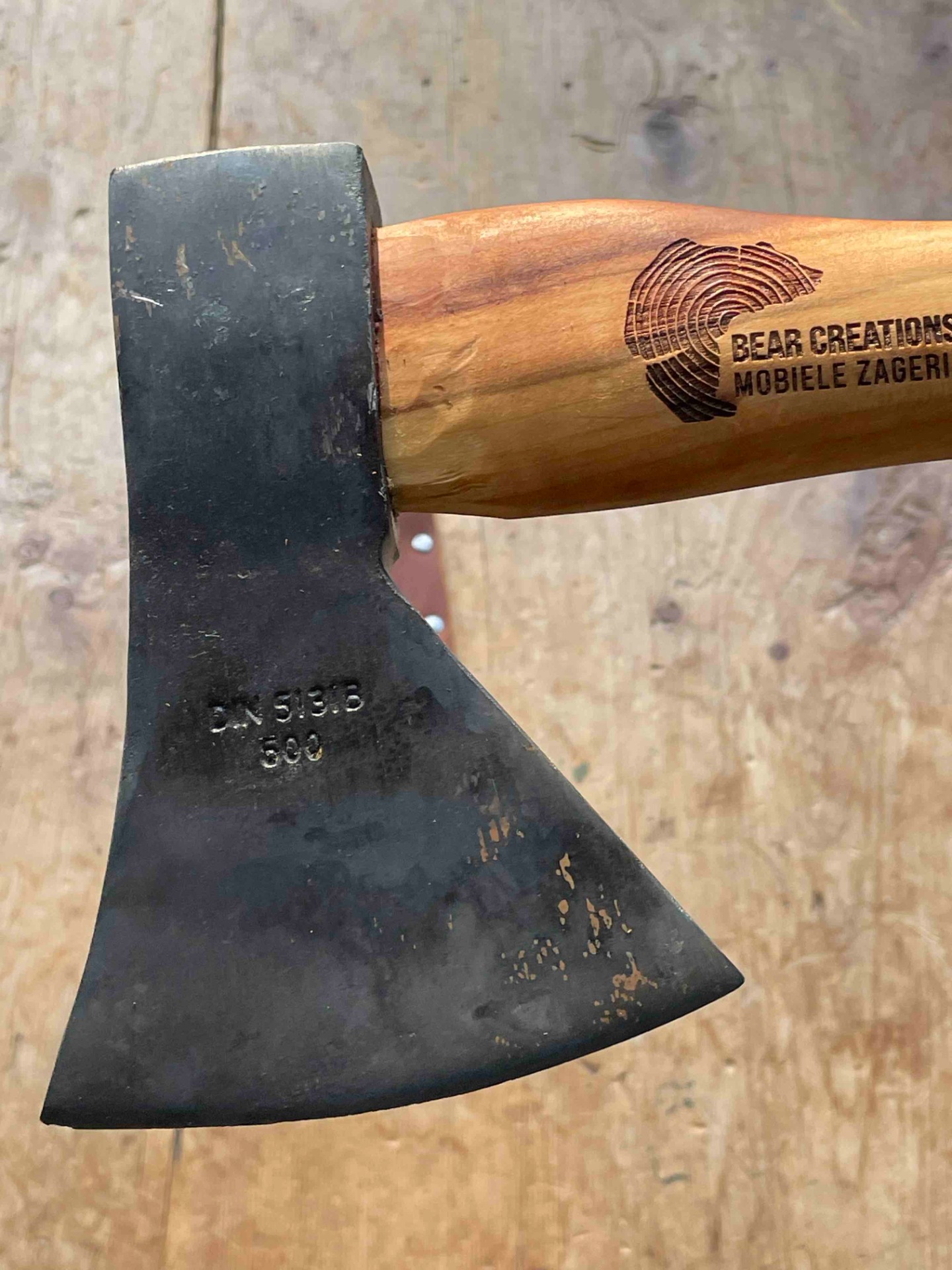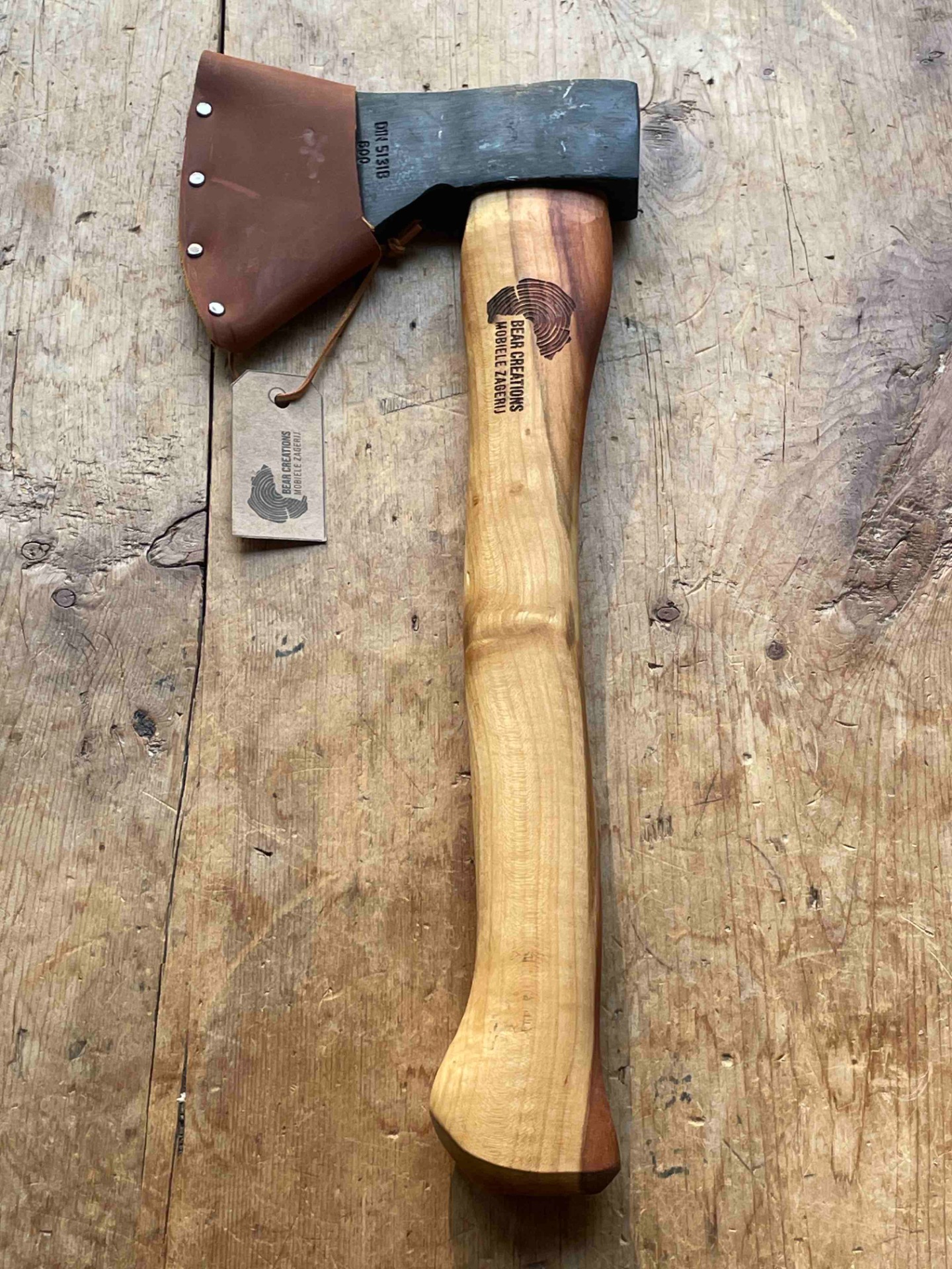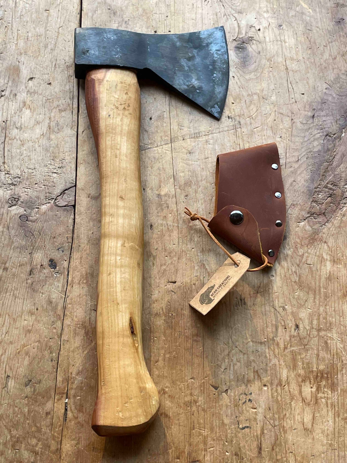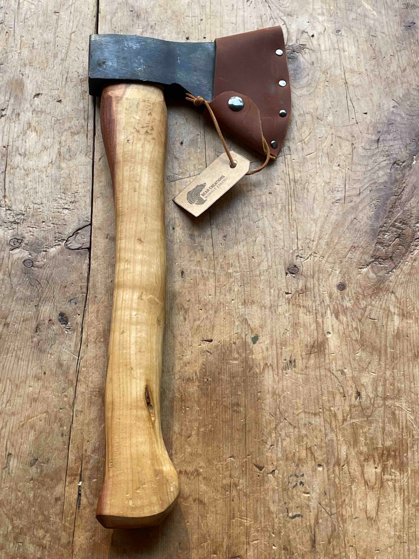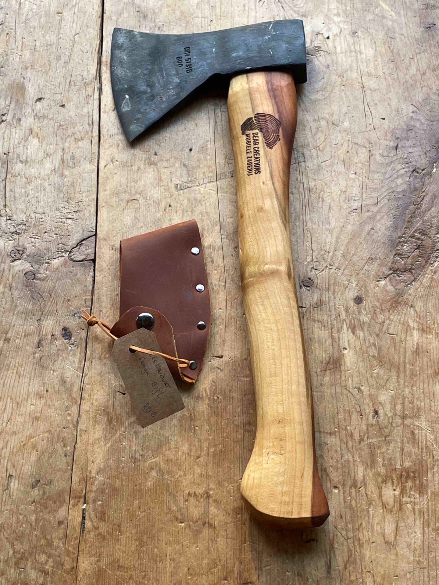 Bijl 600gr met bijlsteel uit lokale kers met een zeer mooi contrast in het hout . Het hout van deze kers is afkomstig uit kessel . Met handgemaakte bijlcover . De bijl word bij verkoop naar wens geslepen . Scherpe hoek voor lepelsnijders ,stompere hoek voor de meer allround toepassingen .
