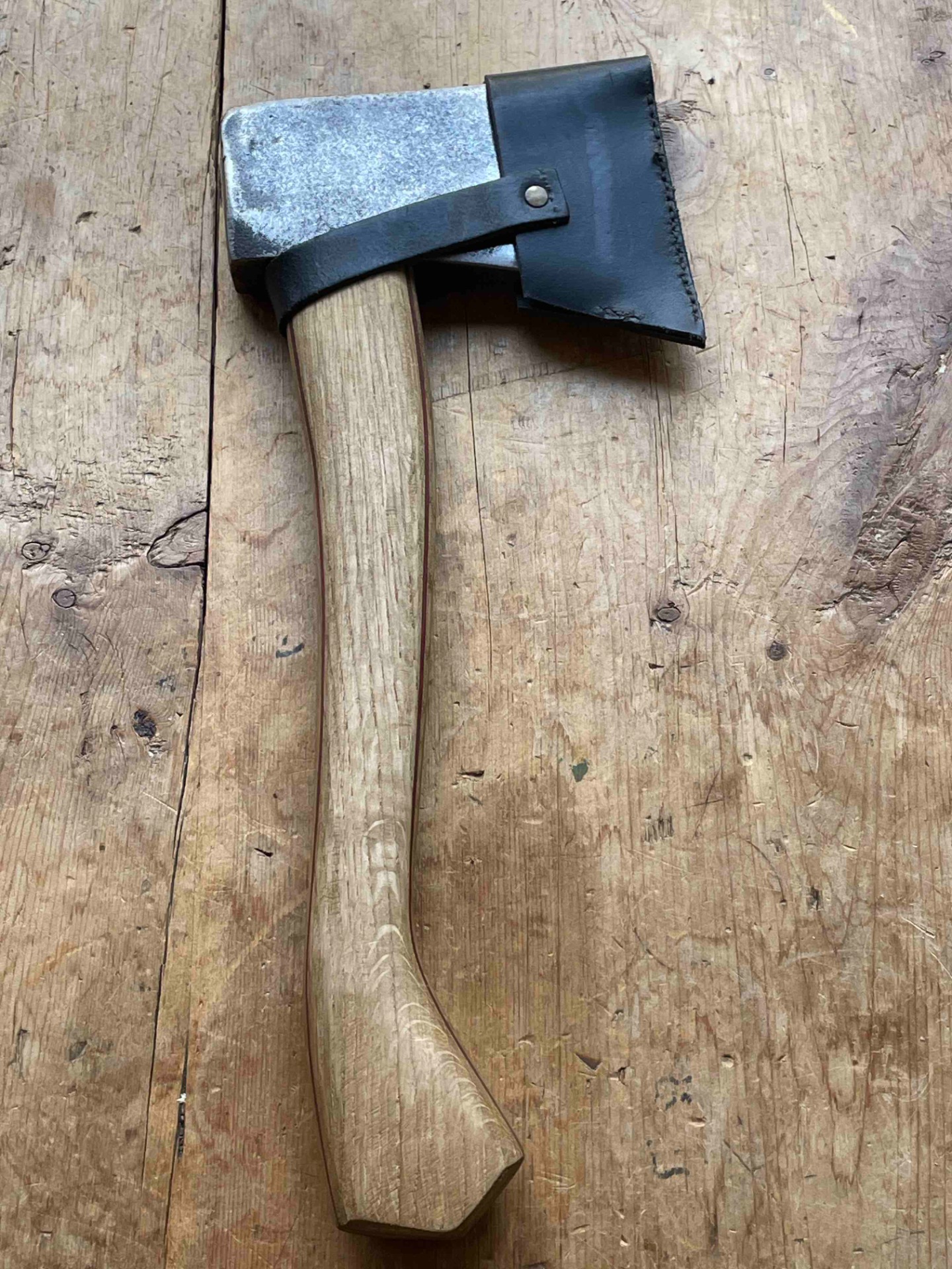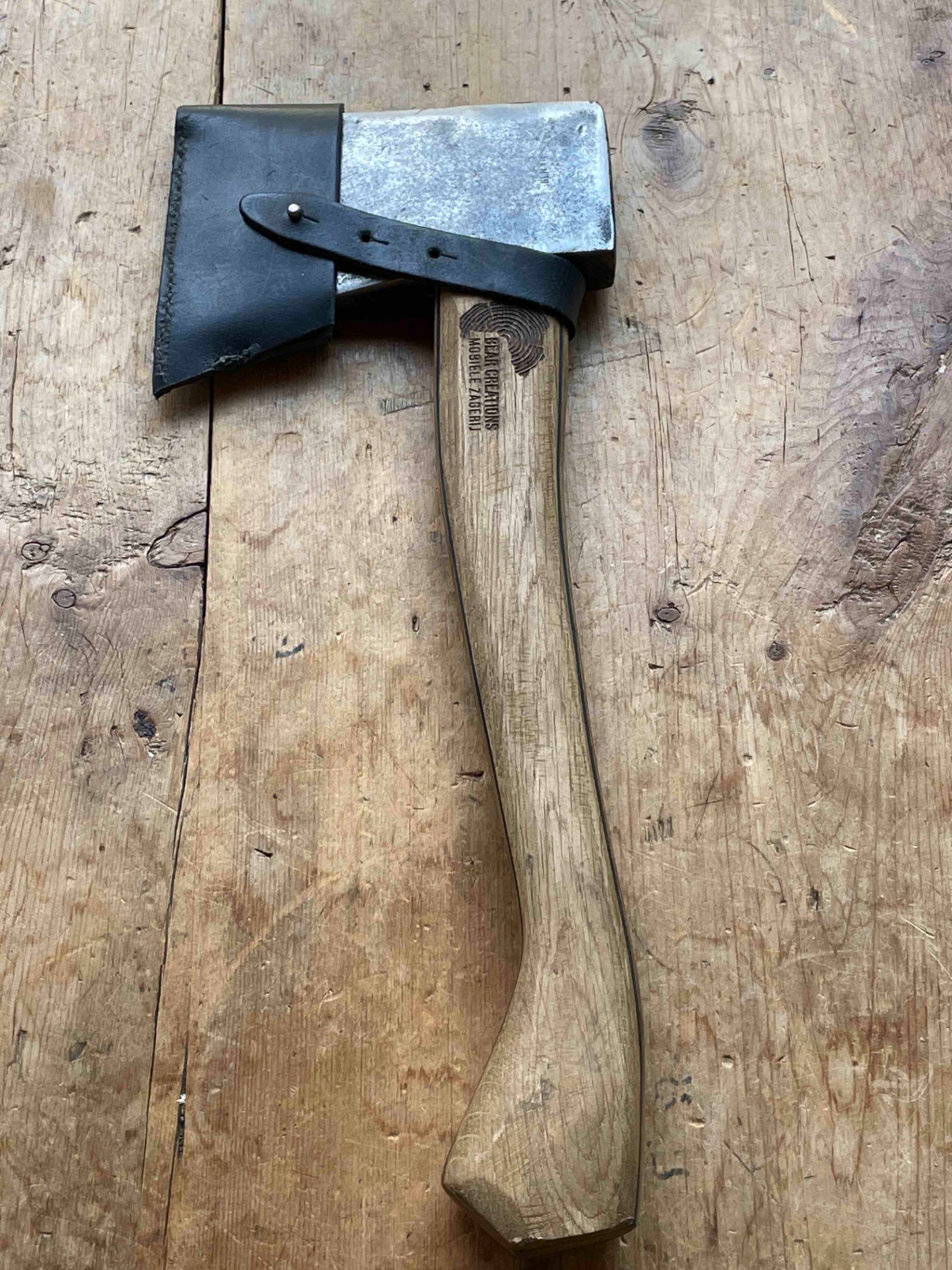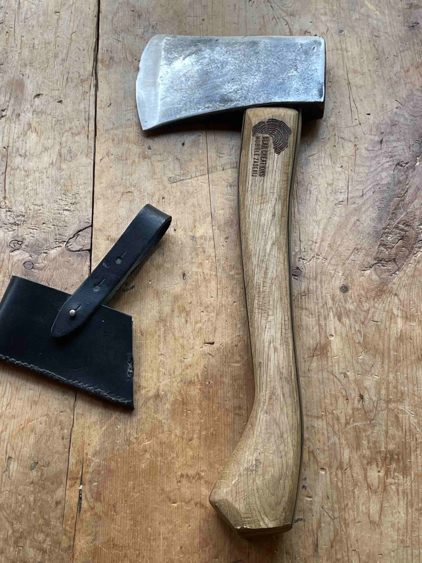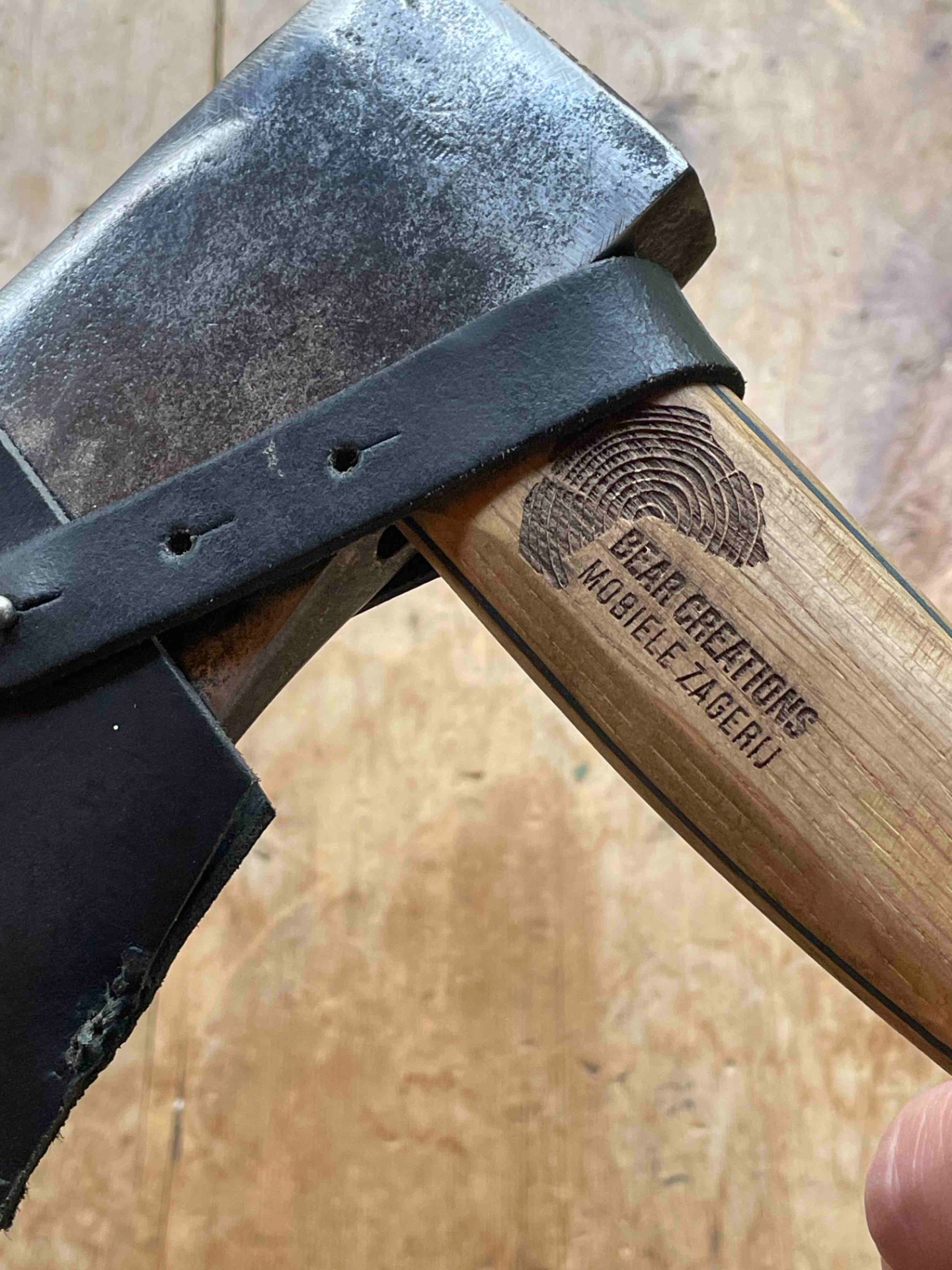 Een Handcarved bijlsteel met 2 kleuren berk gecombineerd met Inlands eiken en een bijlkop van 1kg (voor het zwaardere werk ) bijlcover gemaakt van een oude broeksriem ligt zeer fijn in de hand .