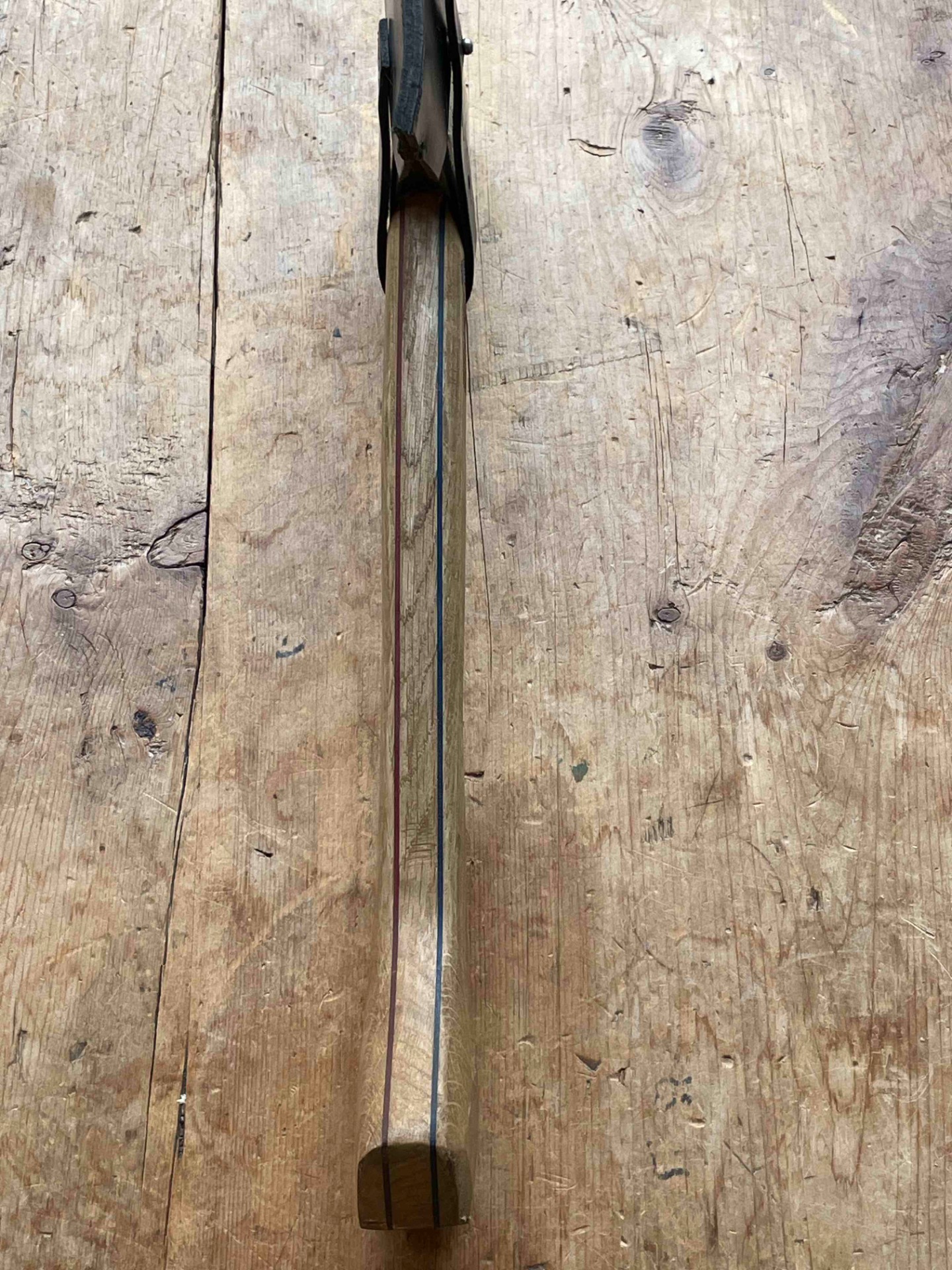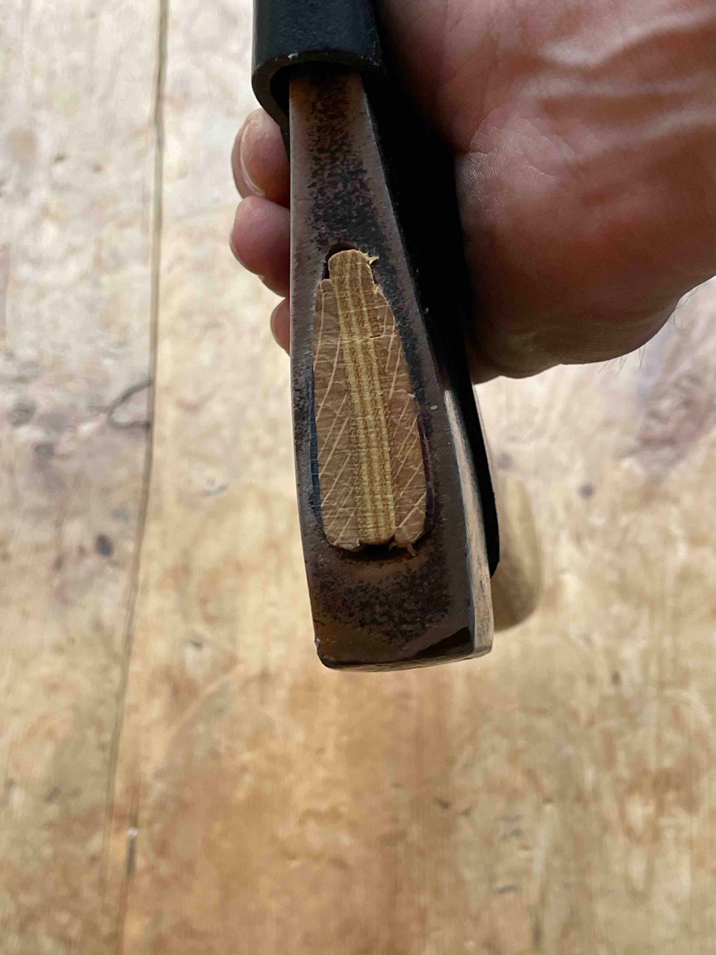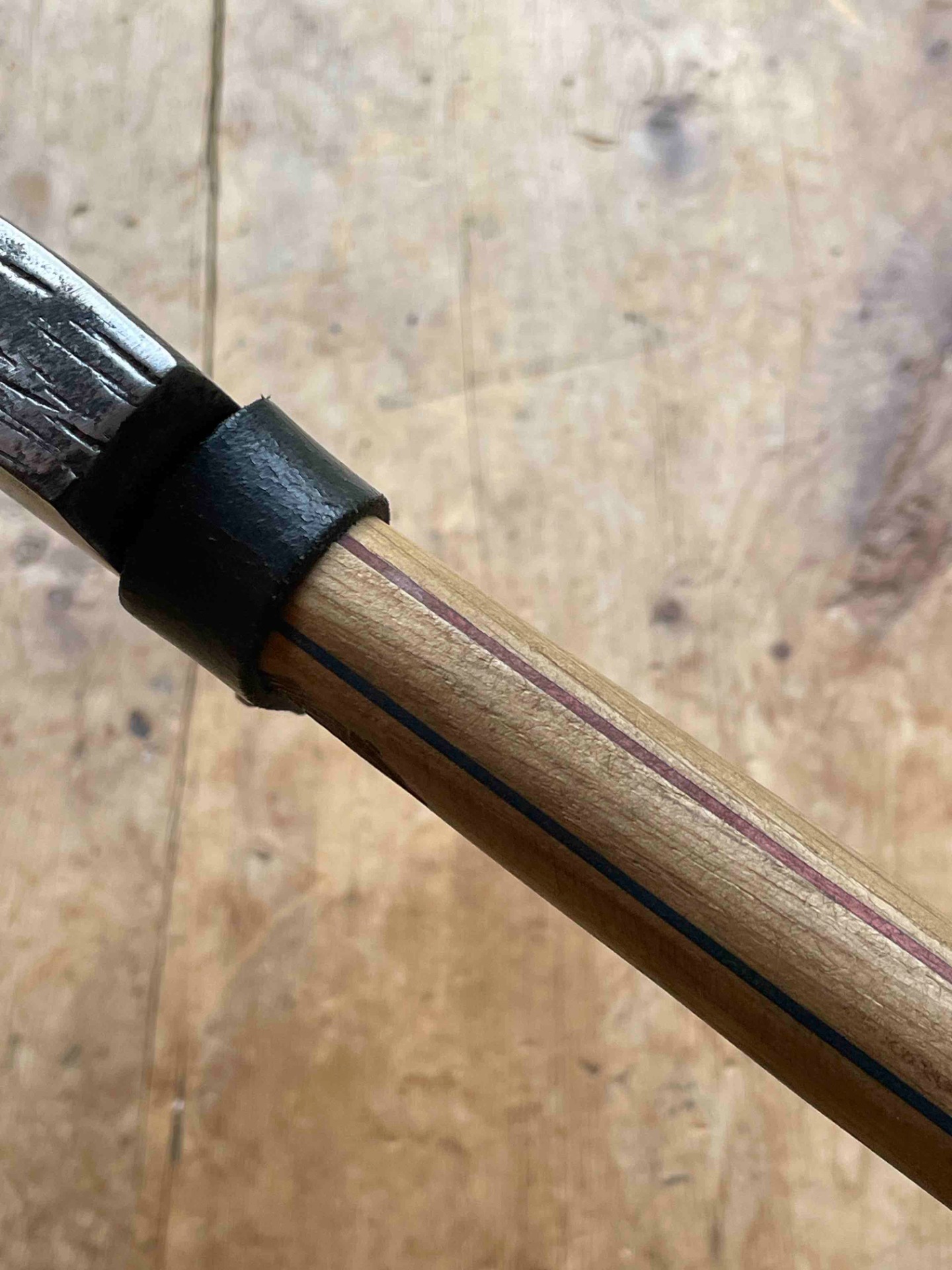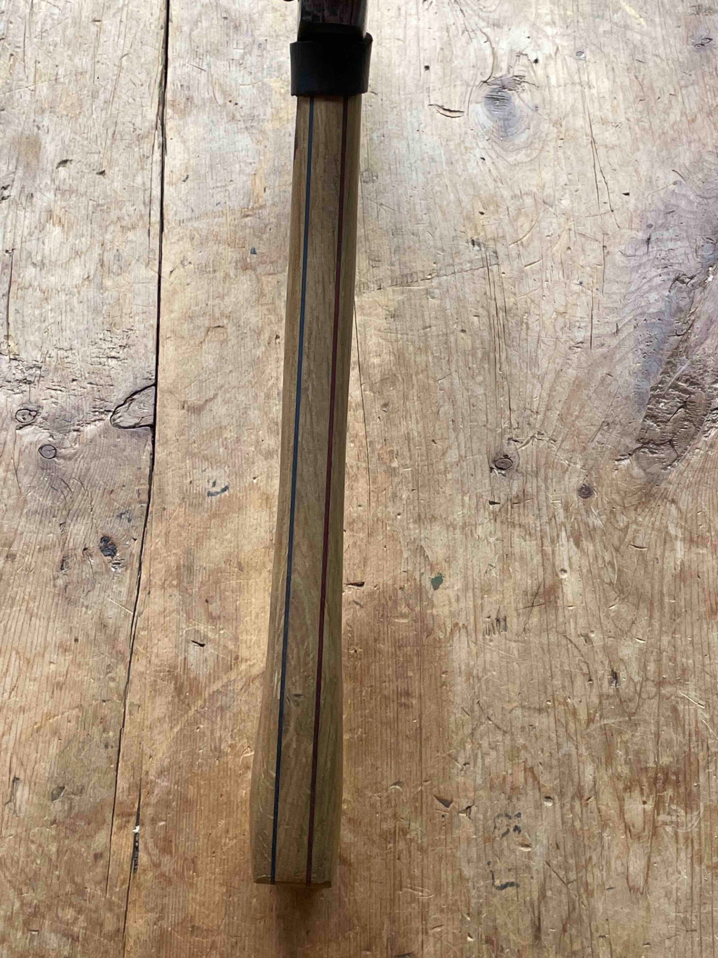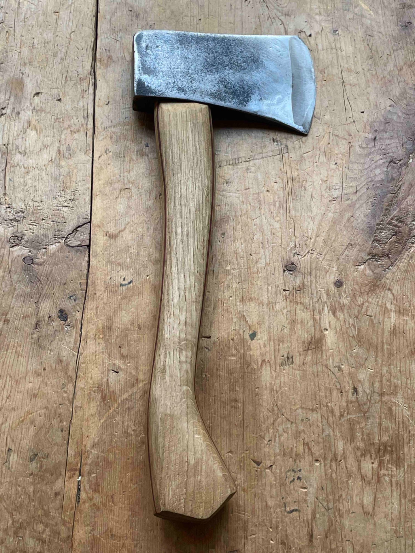Een Handcarved bijlsteel met 2 kleuren berk gecombineerd met Inlands eiken en een bijlkop van 1kg (voor het zwaardere werk ) bijlcover gemaakt van een oude broeksriem ligt zeer fijn in de hand .